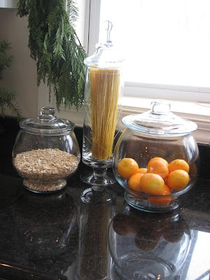 Some of the plates are my Grandma Maestranzi's and I found the sparkly glass tumblers & center plates at volo. The mercury candleholders are from Target. The apothacary jars (below) are from Target & are a $35 substitute for the $350 white Fire King set of cannisters I found at Volo. Now I think I'm happier with these!