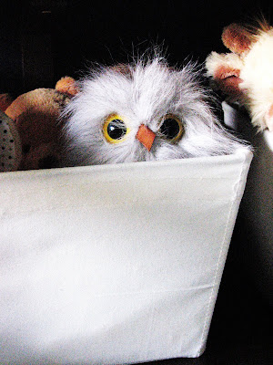 I love baskets in kids' rooms too. They're so easy for clean-up and encourage little ones to partake. (I am all for a little free labor!) Below is a close-up of an owl I had when I was a little girl: