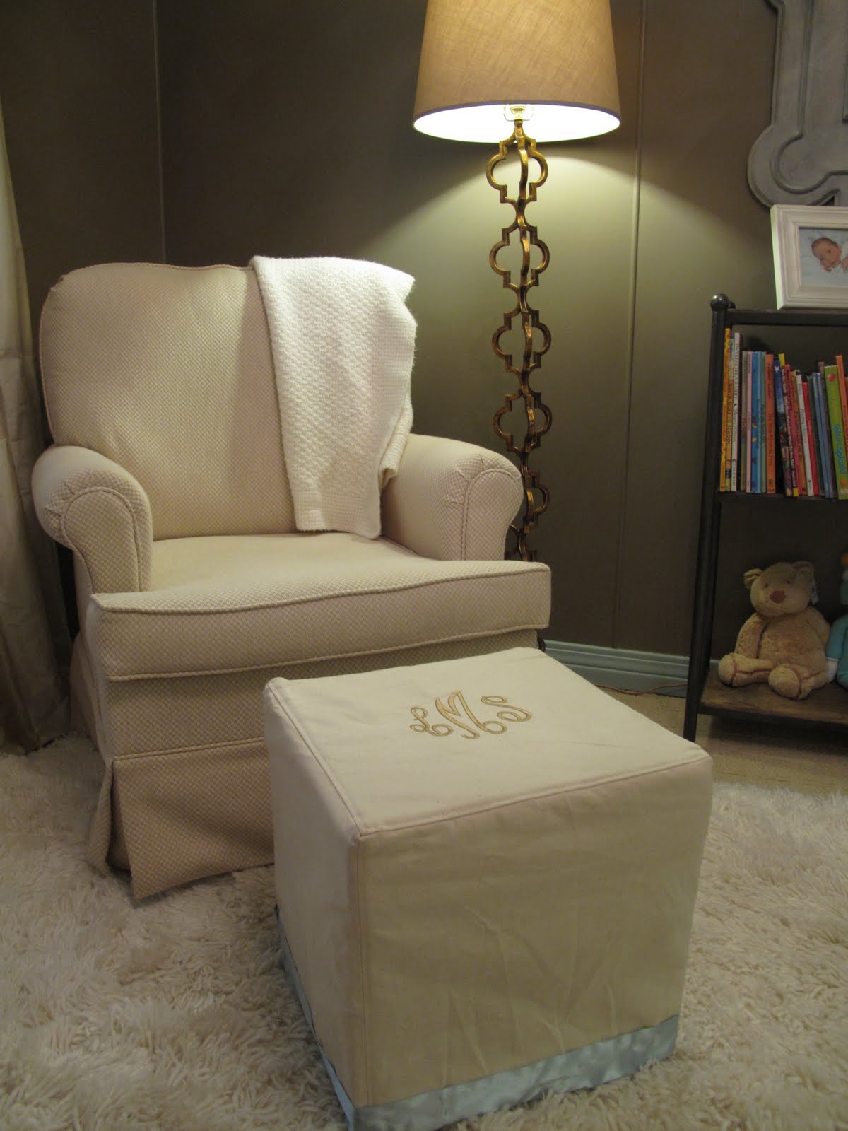 I love this nursery. You did a great job. Love the neutral palette. Everything looks so calm and serene. Love the monogrammed ottoman. Great job.