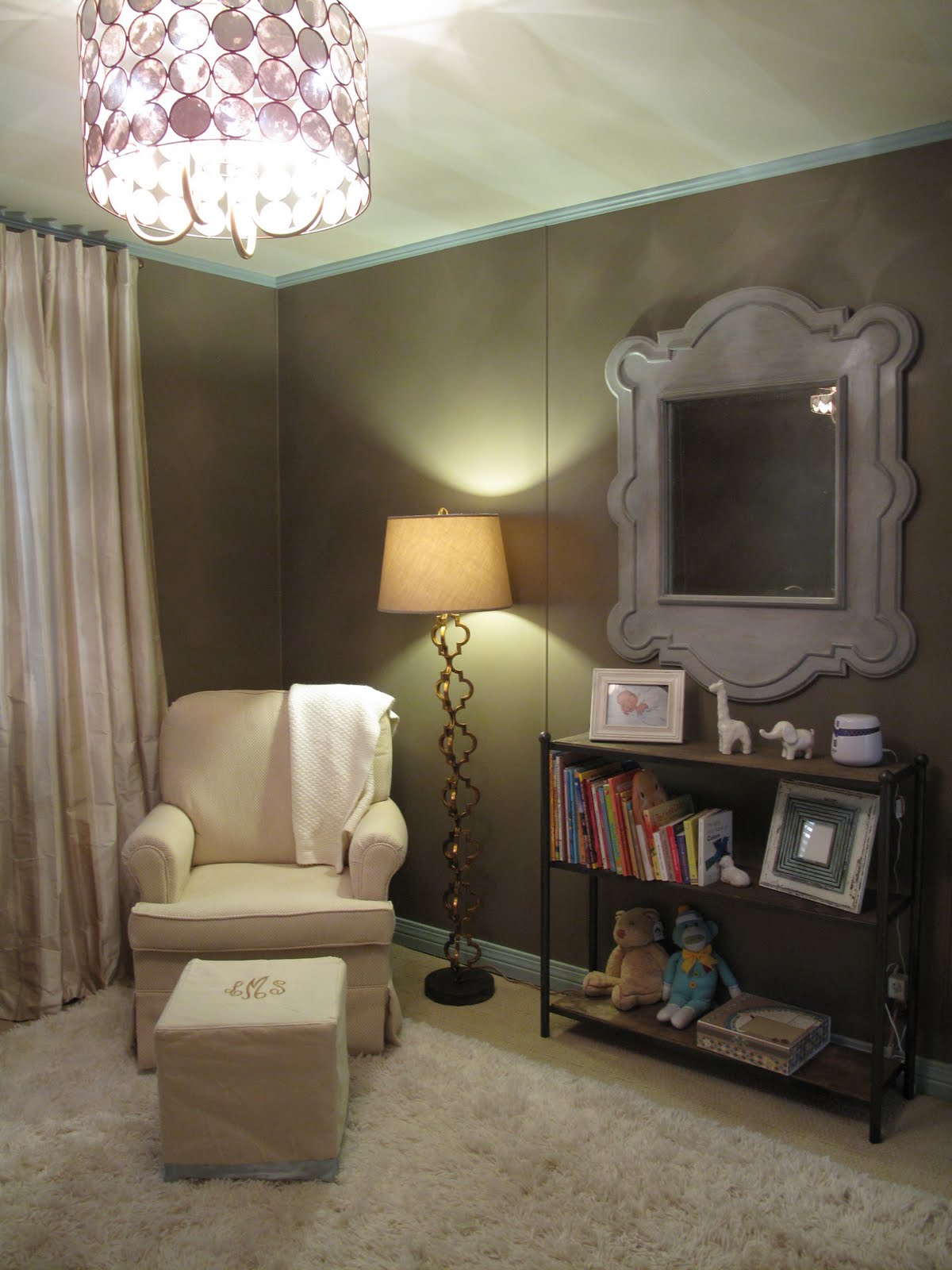 Who wouldn't LOVE to be the baby in that room?!?! Love the floor lamp, the mirror, the way the trim coordinates with the trim on the ottoman. Perfection!
