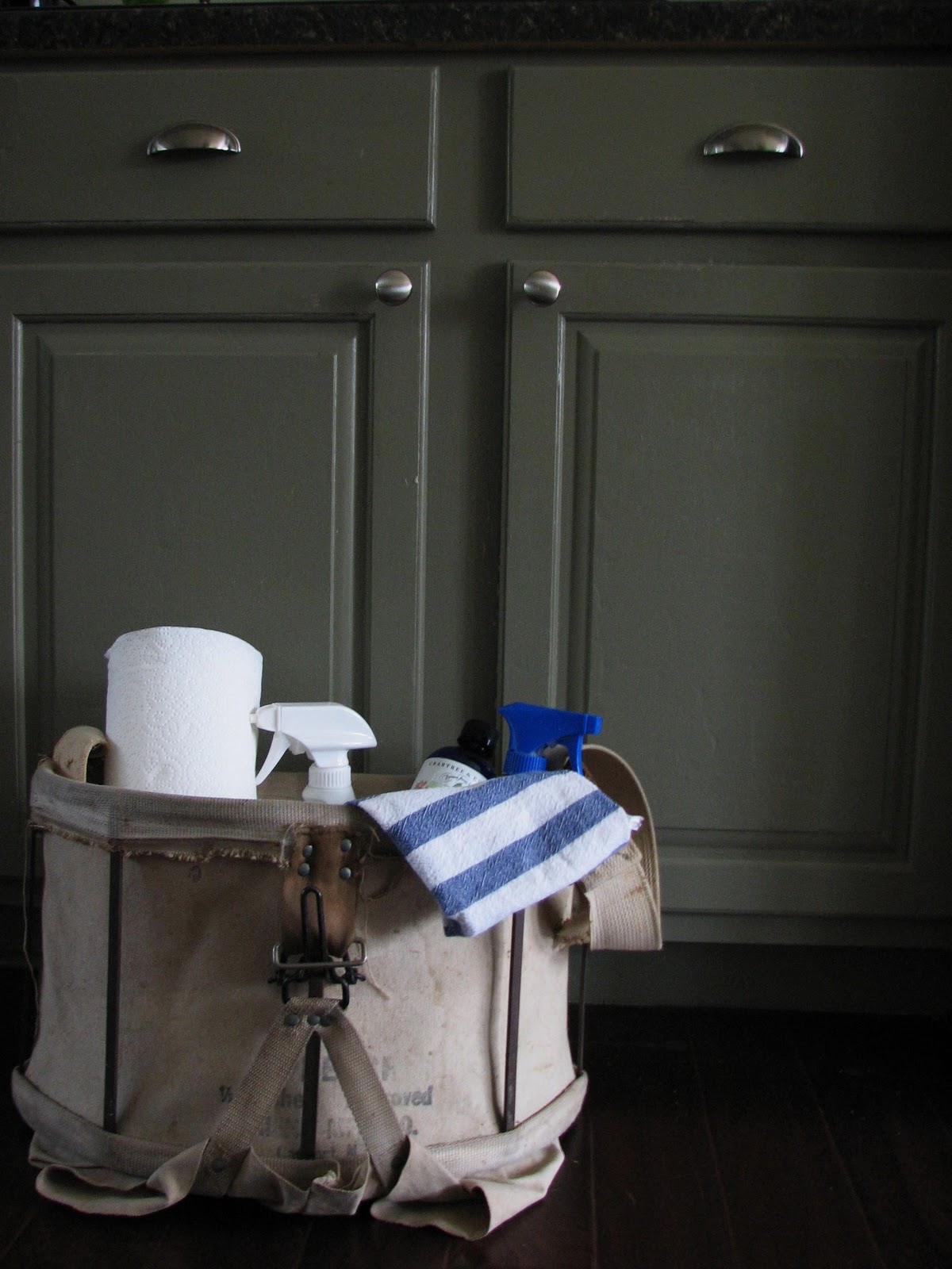 {Fruit picker used to hold cleaning supplies & get them from room to room}
