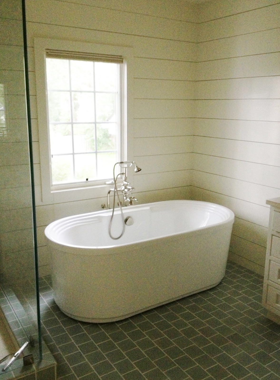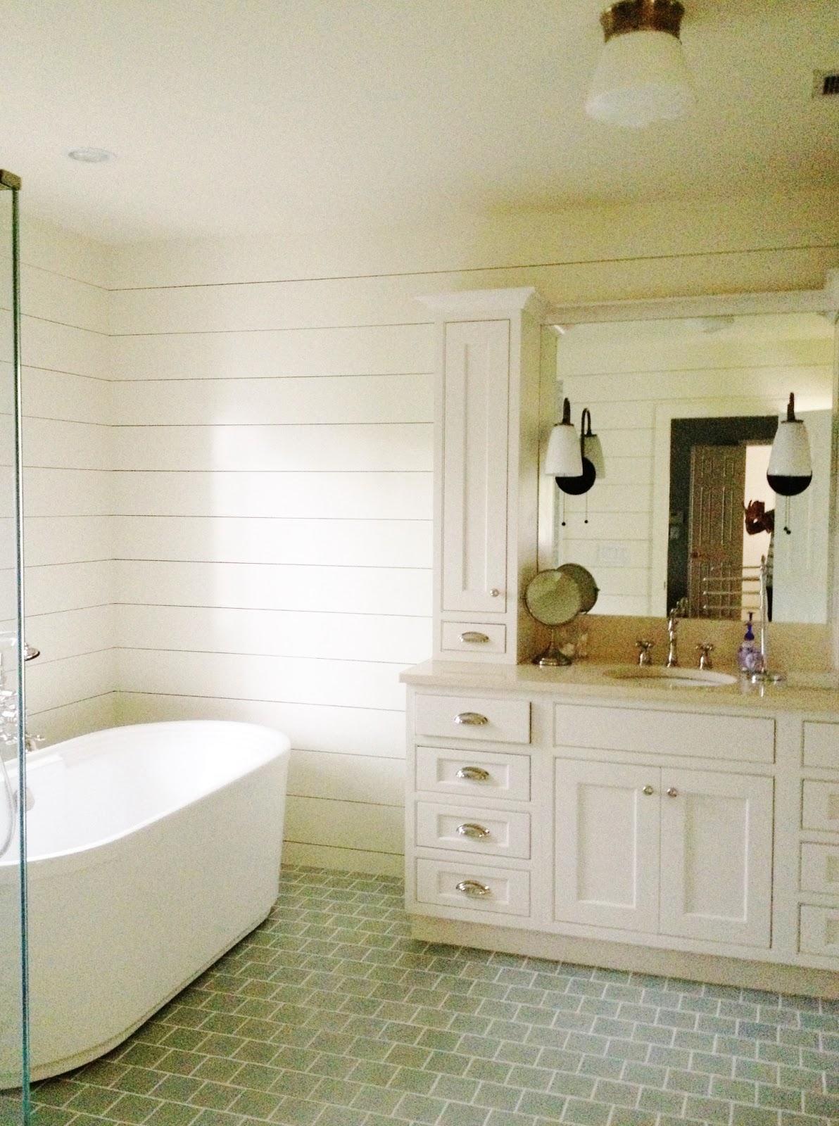 The shiplap walls add so much warmth and texture to the bathroom. It feels so much more substantial now and has that slight coastal eel that my clients love. We had them painted the same color as the ceiling. The pale blue floors are made up of 4x4 tiles which we had laid in a brick pattern.