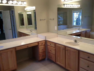 {My clients didn't need a sitting vanity area but preferred his and hers sinks. We also saw that there was a big chunk of wasted space in the corner between the counter tops. My favorite thing about the original bathroom was that the toilet was in its own room & we kept it that way.}