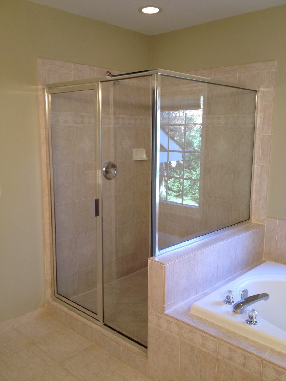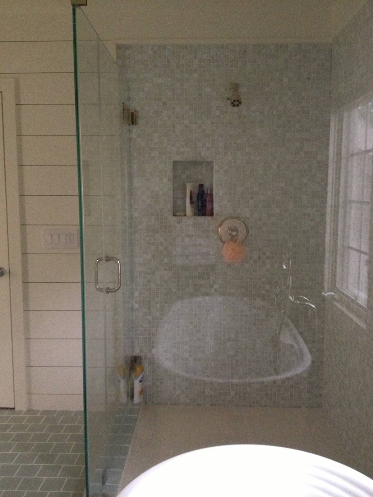 The shower surround is now a frameless glass one (our clients selected clear glass) so it takes up so much less visual space in the room. It was tough to get a good photo: