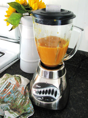 I don't have a food processor or one of those magic bullet things, but the blender works just fine. Add in some of the leftover water from steaming because it's chock-full of nutrients & because you'll need water anyway to get it to the right consistency. (You can even save it and use it for making broths if you have more leftover.)