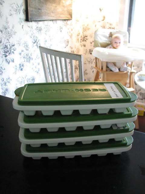 We got a bunch of these "fresh baby" puree trays from Babies R Us when we had Christian. They're amazing because they have lids. I've used ice cube trays too in a pinch, but love the fact that I don't have to get into messy plastic wrap or any of that with these. (And you know I'm not one for gadgets, so if I get them, trust me, they're worth it.)