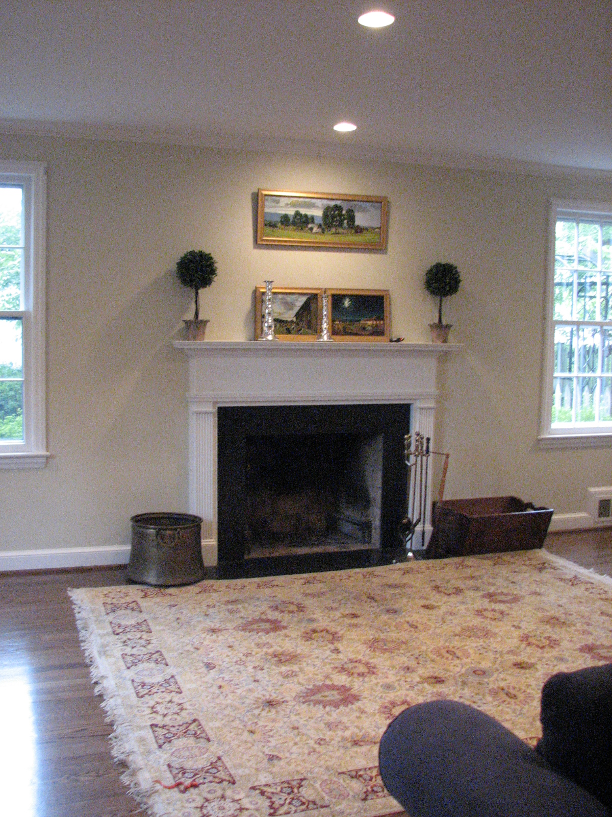 They already had a beautiful rug that we all decided should stay, and the paintings over the mantle are actually of my clients' farmhouse on their wedding day. If you look in the paintings, you can see my clients and their families & friends having a blast. (There are even fireworks in one painting!!! Wish I'd known them sooner!! ;) ;) So, of course, those were staying!! We also had a tan sofa to work with (not pictured) and we built the room around these things.